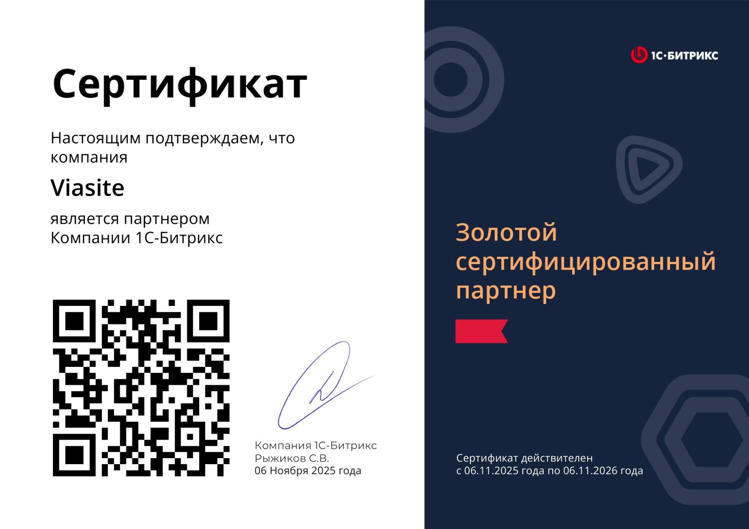 Сертификат золотого сертифицированного партнера «1С-Битрикс»